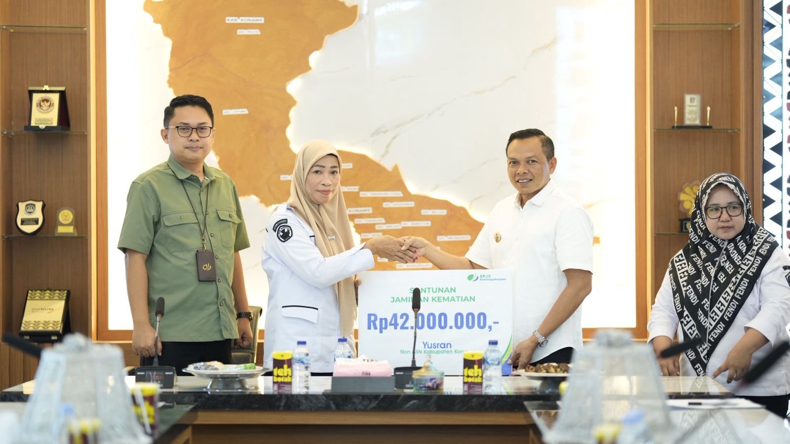 Konawe, Ntrinews.com – Bupati Konawe Yusran Akbar serahkan santunan kematian (Jaminan Kematian/JKM) dari BPJS Ketenagakerjaan sebesar Rp42 Juta Rupiah, kepada ahli waris almarhum Yusran, staf Bagian Umum Sekretariat Daerah Kabupaten Konawe.
