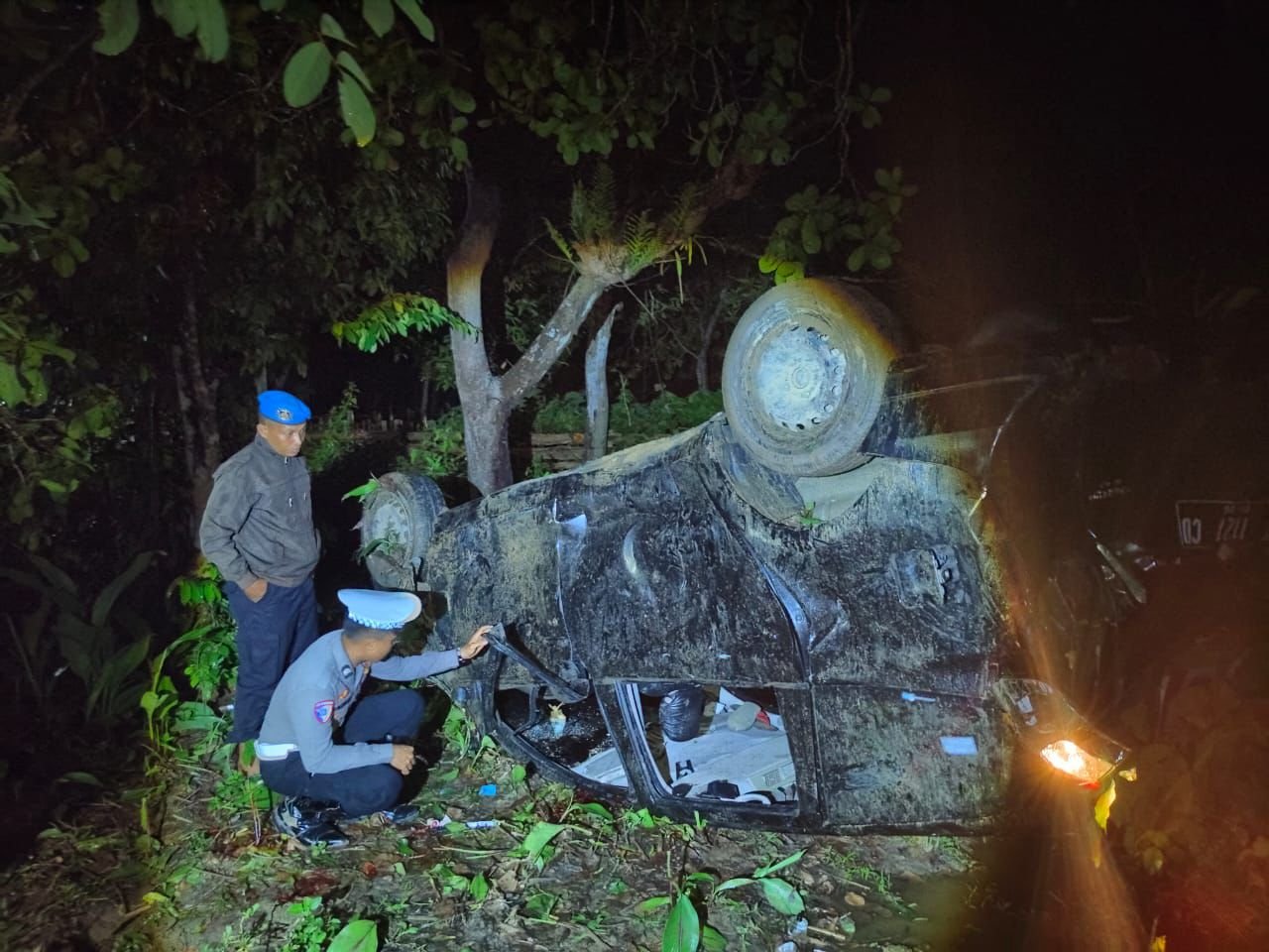 Korban LH (39) tewas usai Mobil Wulling Confero DT 1080 R yang dikemudikannya, menabrak pagar rumah warga, hingga terguling dan terbalik.