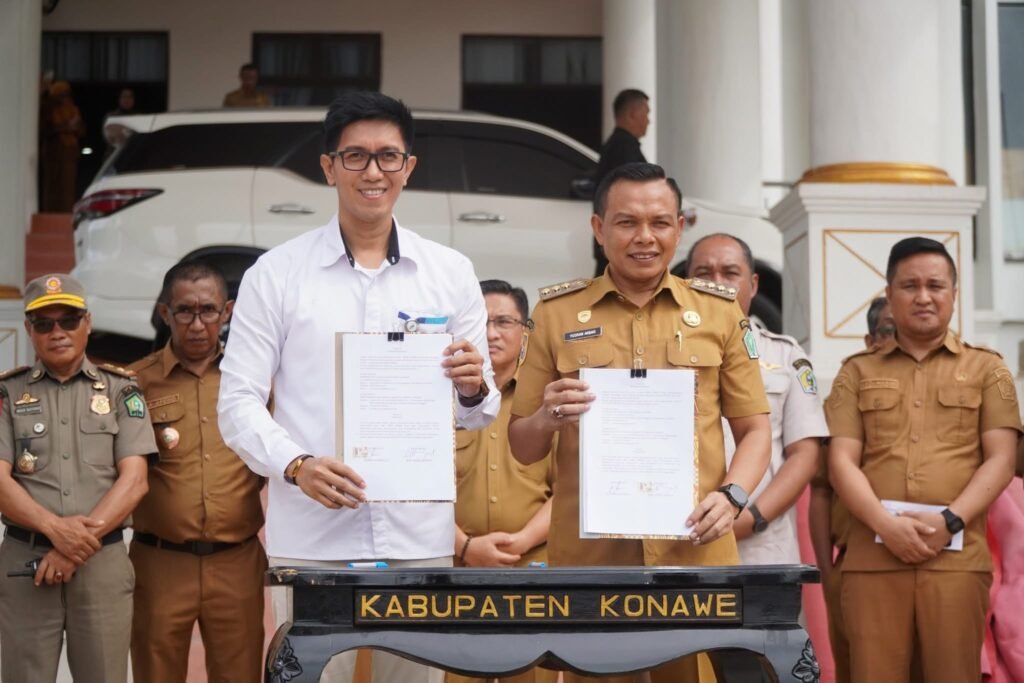 Bupati Konawe Yusran Akbar dengan Pimpinan Perum Bulog KC Unaaha Muh. Abdan Djarmin usai menandatangani Master of Understanding atau MoU bantuan 100 ton berada kepada korban bencana Aceh-Sumatra. Senin (15/12/2025)