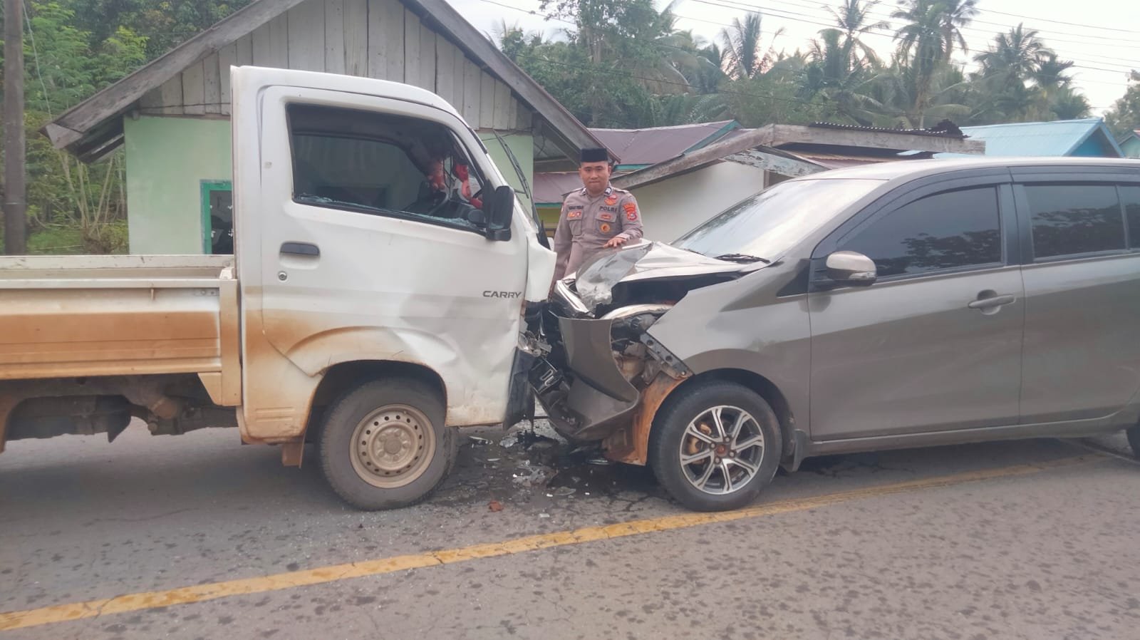 Kecelakaan libatkan mobil Daihatsu Sigra warna Coklat Metalik nopol DT 14** DC dengan Pikap Suzuki warna putih nopol DT 82** AO.